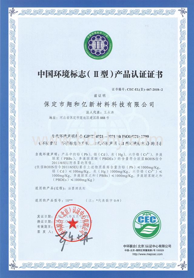 我公司于2018年5月通過中環聯合(北京)認證中心對我公司嚴格審查,認證通過并獲得《中國環境標志(II型)產品認證證書》—認證產品名稱:潤版液,油墨清洗劑。